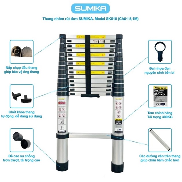 Thang rút đơn Sumika Model: SK510 13 bậc, chân ngang, chiều cao 5.1m